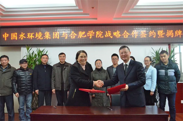 2016年11月30日,中国水环境集团与合肥学院在南艳湖校区举行校企战略合作签约暨揭牌仪式,开启双方在人才培养和科学研究等方面的全面战略合作。中国水环境集团安徽公司负责人陈怀、副总经理杨卫国,合肥学院副校长陈秀、科技处处长吴克及研究生处、教务处、生物与环境工程系等部门和单位领导出席签约仪式。